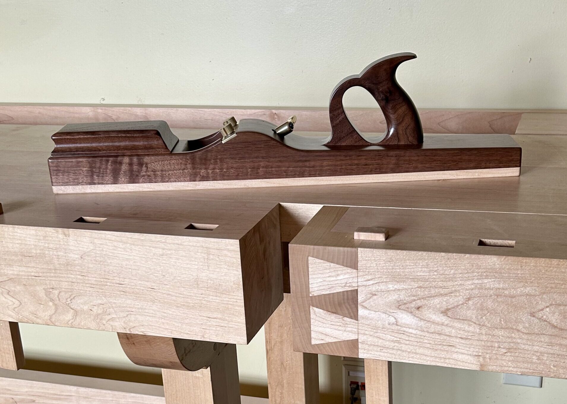 The thin blade is sandwiched between a massive frog which is 3/4″ thick at the bottom and a backup iron which is 3/16th” thick. The chipbreaker can eliminate tearout and guides the shavings up and into the throat. The reverse angle of the frog matches the angle at the front of the throat, so the old problem of the throat widening as the sole is worn down from truing is no longer an issue. In fact, you can take 3/8″ off the sole and the opening will still be the same! The frog is adjusted for blade depth and lateral projection with the two adjusting nuts at the top of the plane. By being situated at the outer sides of the frog, adjusting depth also controls lateral adjustment so no separate lateral adjuster is required. There is no backlash in these adjusting screws, so this is a very fast and precise process.